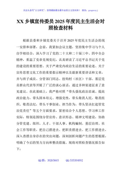 / XX乡镇宣传委员2025年度民主生活会对照检查材料