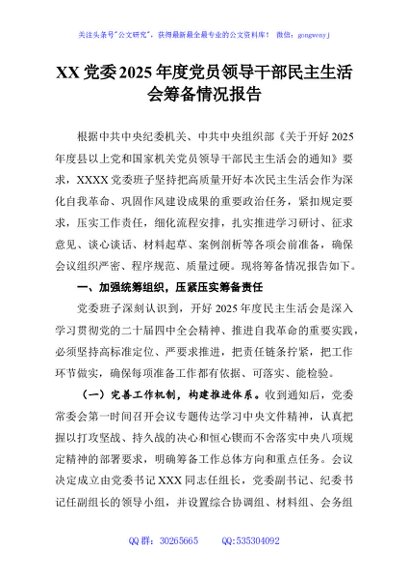 / XX党委2025年度党员领导干部民主生活会筹备情况报告