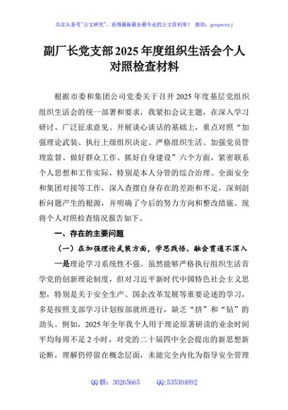/ 副厂长党支部2025年度组织生活会个人对照检查材料