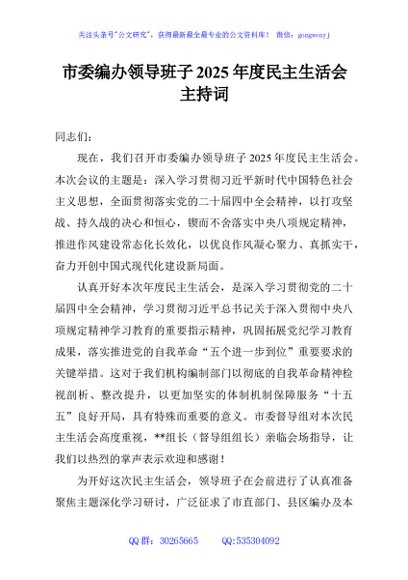 / 市委编办领导班子2025年度民主生活会主持词