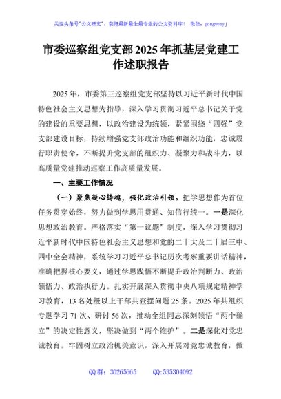 / 市委巡察组党支部2025年抓基层党建工作述职报告