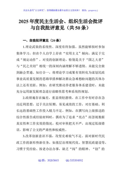 / 2025年度民主生活会、组织生活会批评与自我批评意见(共50条)