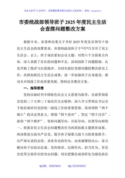 / 市委统战部领导班子2025年度民主生活会查摆问题整改方案