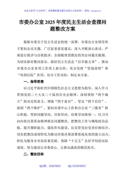 / 市委办公室2025年度民主生活会查摆问题整改方案
