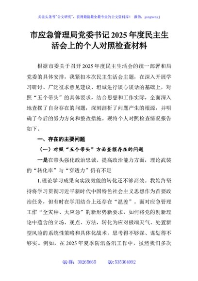 / 市应急管理局党委书记2025年度民主生活会上的个人对照检查材料
