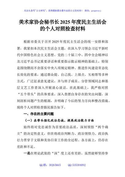 / 美术家协会秘书长2025年度民主生活会的个人对照检查材料