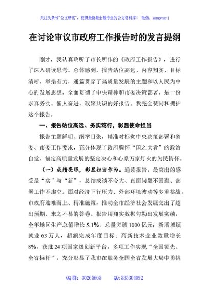 / 在讨论审议市政府工作报告时的发言提纲