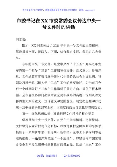 / 市委书记在XX市委常委会议传达中央一号文件时的讲话