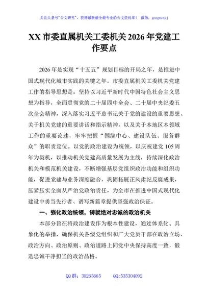 / XX市委直属机关工委机关2026年党建工作要点