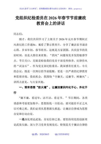 / 党组织纪检委员在2026年春节节前廉政教育会上的讲话
