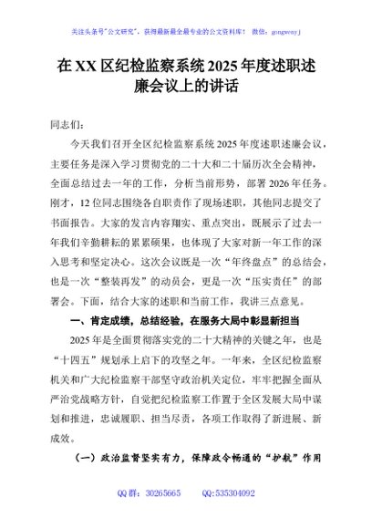 / 在XX区纪检监察系统2025年度述职述廉会议上的讲话