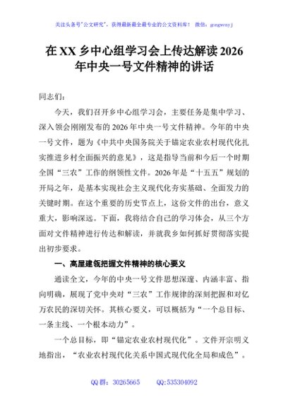 / 在XX乡中心组学习会上传达解读2026年中央一号文件精神的讲话