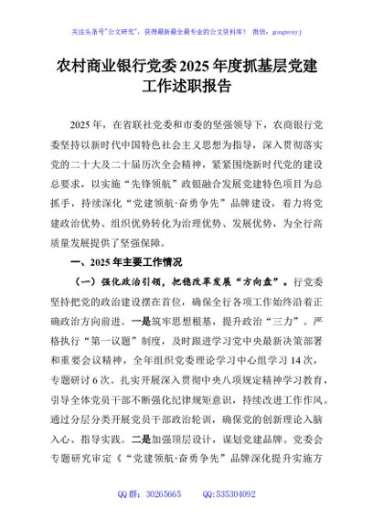 / 农村商业银行党委2025年度抓基层党建工作述职报告