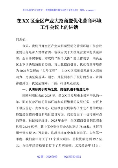 / 在XX区全区产业大招商暨优化营商环境工作会议上的讲话
