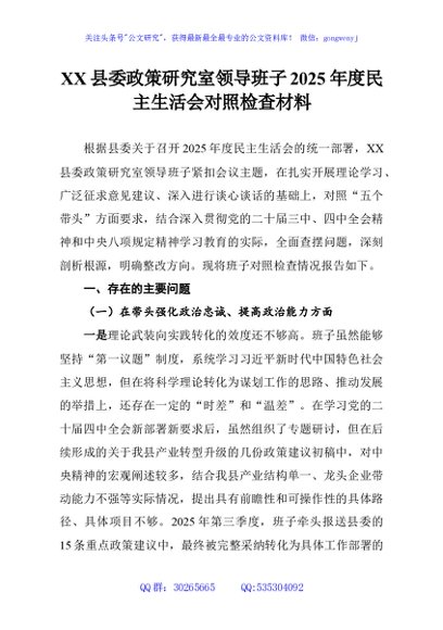 / XX县委政策研究室领导班子2025年度民主生活会对照检查材料