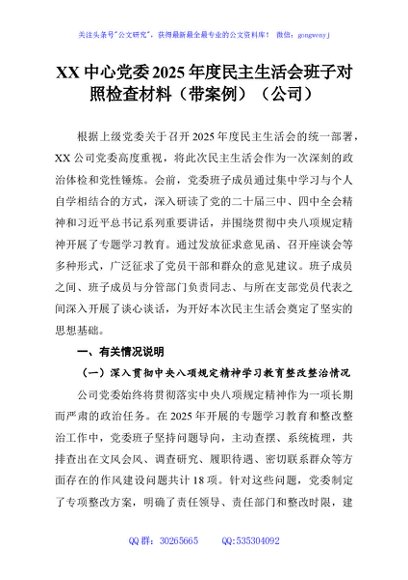 / XX中心党委2025年度民主生活会班子对照检查材料(带案例)(公司)