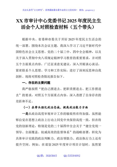 / XX市审计中心党委书记2025年度民主生活会个人对照检查材料(五个带头)