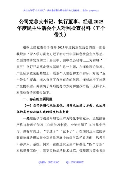 / 公司党总支书记、执行董事、经理2025年度民主生活会个人对照检查材料(五个带头)