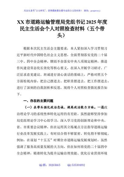 / XX市道路运输管理局党组书记2025年度民主生活会个人对照检查材料(五个带头)