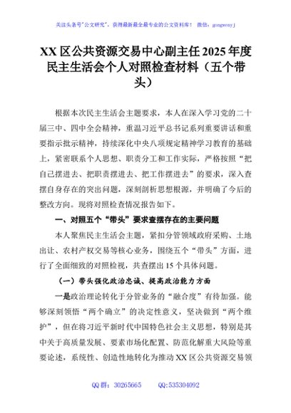 / XX区公共资源交易中心副主任2025年度民主生活会个人对照检查材料(五个带头)