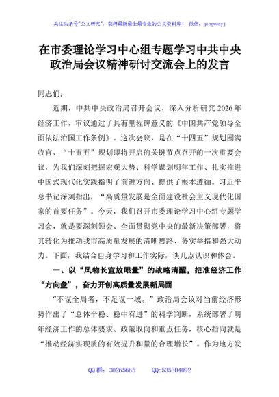 / 在市委理论学习中心组专题学习中共中央政治局会议精神研讨交流会上的发言