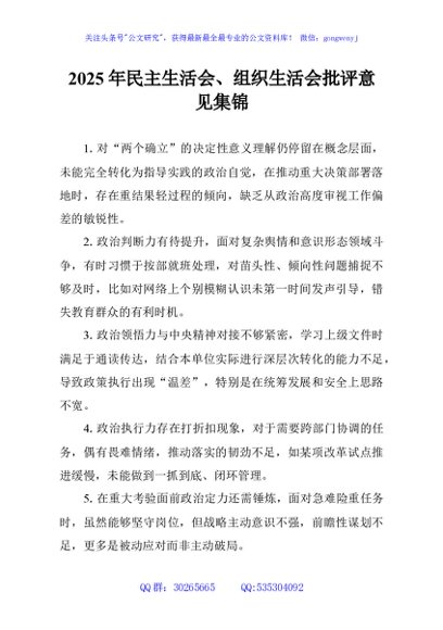 未生成预览图,长按二维码添加 2025年民主生活会、组织生活会批评意见集锦 - 公文研究