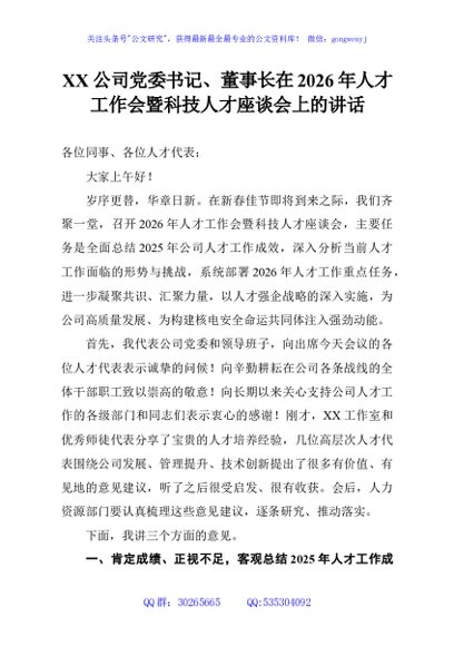 XX公司党委书记、董事长在2026年人才工作会暨科技人才座谈会上的讲话 - 公文研究