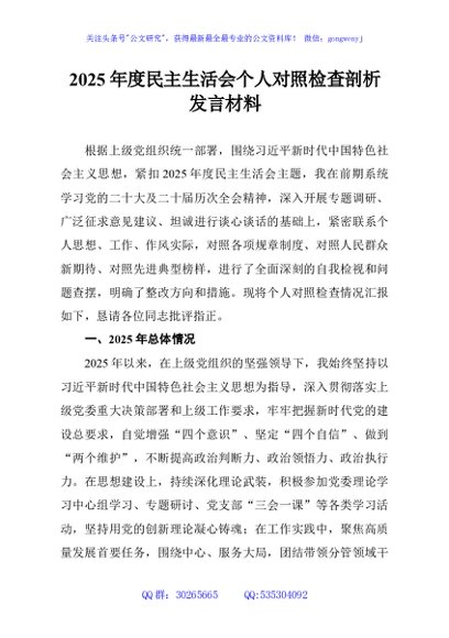 未生成预览图,长按二维码添加 2025年度民主生活会个人对照检查剖析发言材料 - 公文研究