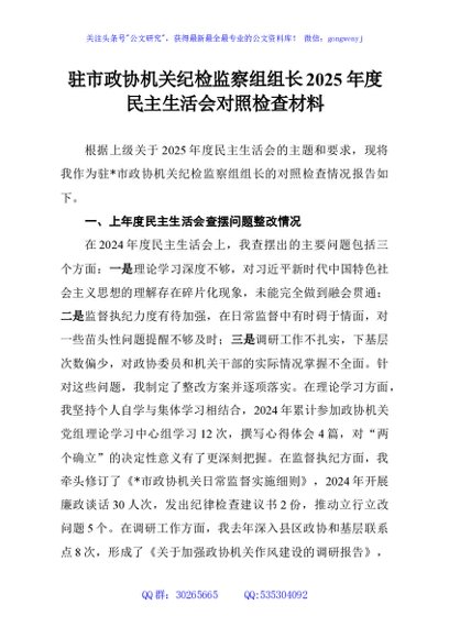 / 驻市政协机关纪检监察组组长2025年度民主生活会对照检查材料