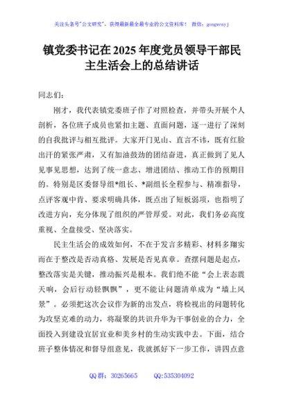 / 镇党委书记在2025年度党员领导干部民主生活会上的总结讲话