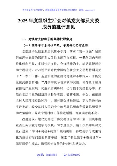 / 2025年度组织生活会对镇党支部及支委成员的批评意见