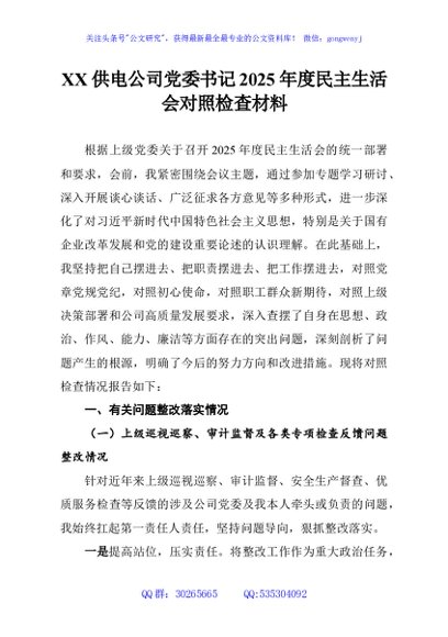 / XX供电公司党委书记2025年度民主生活会对照检查材料