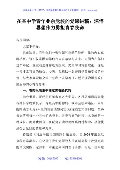 未生成预览图,长按二维码添加 在某中学青年业余党校的党课讲稿:深悟思想伟力勇担青春使命 - 公文研究
