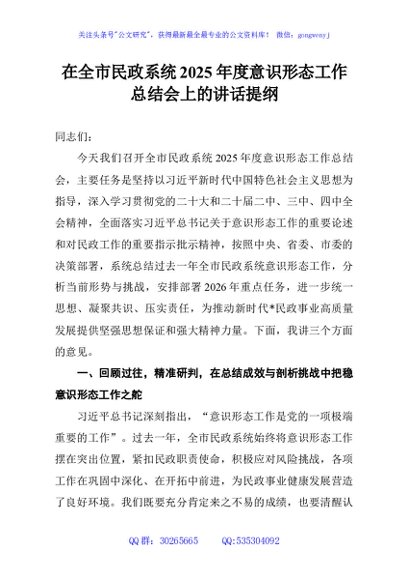 / 在全市民政系统2025年度意识形态工作总结会上的讲话提纲