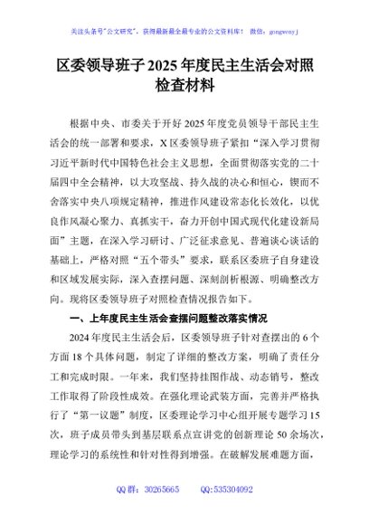 / 区委领导班子2025年度民主生活会对照检查材料