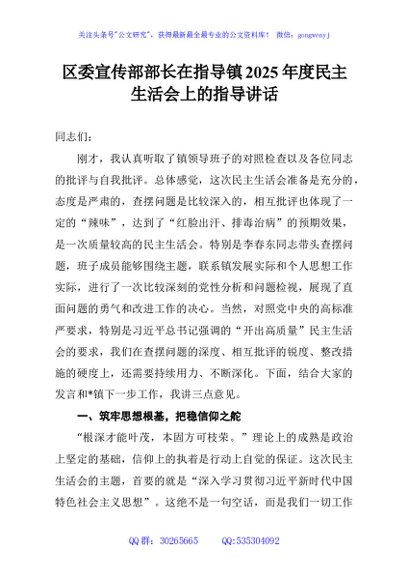 / 区委宣传部部长在指导镇2025年度民主生活会上的指导讲话