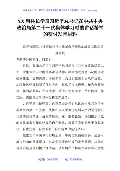 / 副县长学习习近平总书记在中共中央政治局第二十一次集体学习时的讲话精神的研讨发言材料