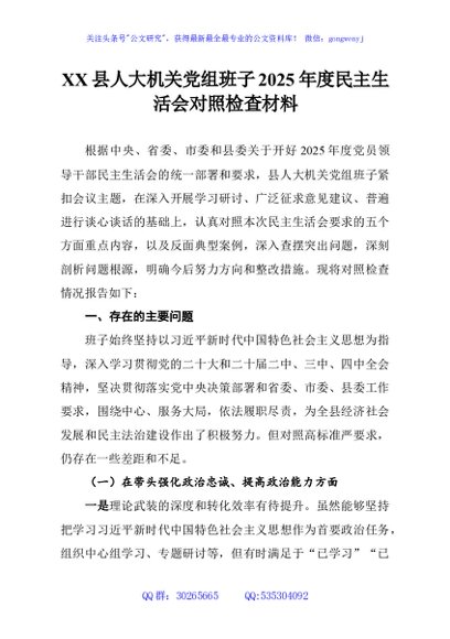 / XX县人大机关党组班子2025年度民主生活会对照检查材料