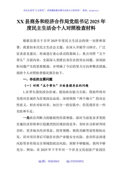 / XX县商务和经济合作局党组书记2025年度民主生活会个人对照检查材料