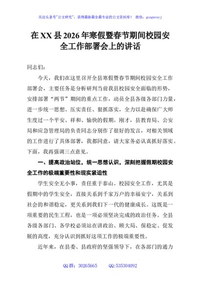 / 在XX县2026年寒假暨春节期间校园安全工作部署会上的讲话