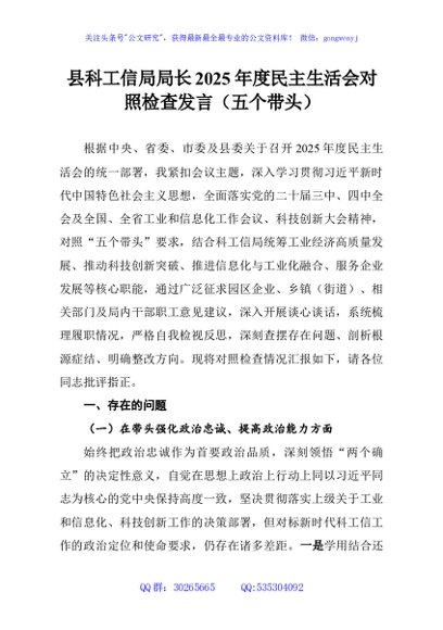 / 县科工信局局长2025年度民主生活会对照检查发言(五个带头)