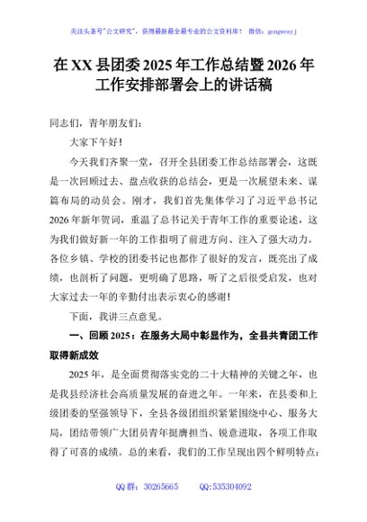 / 在XX县团委2025年工作总结暨2026年工作安排部署会上的讲话稿