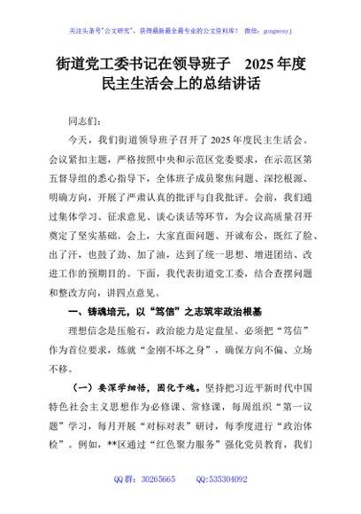 / 街道党工委书记在领导班子2025年度民主生活会上的总结讲话