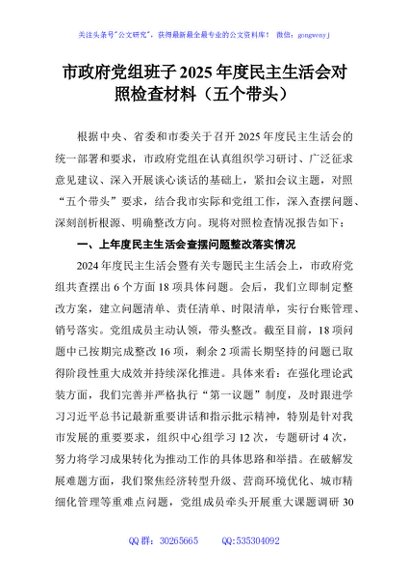 / 市政府党组班子2025年度民主生活会对照检查材料(五个带头)