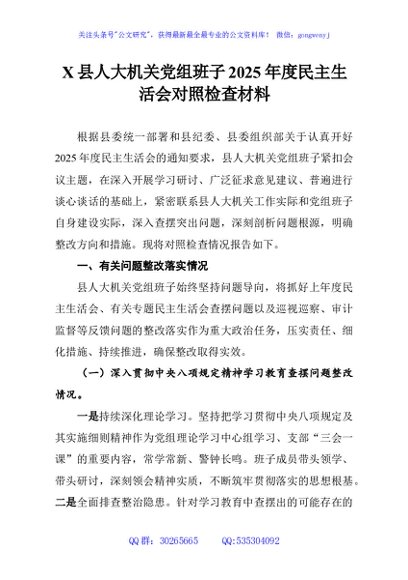 / X县人大机关党组班子2025年度民主生活会对照检查材料