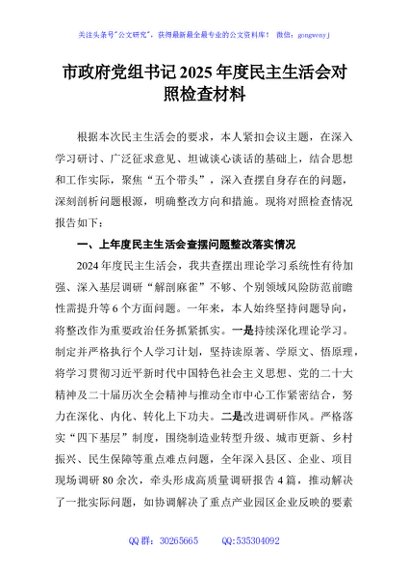 / 市政府党组书记2025年度民主生活会对照检查材料