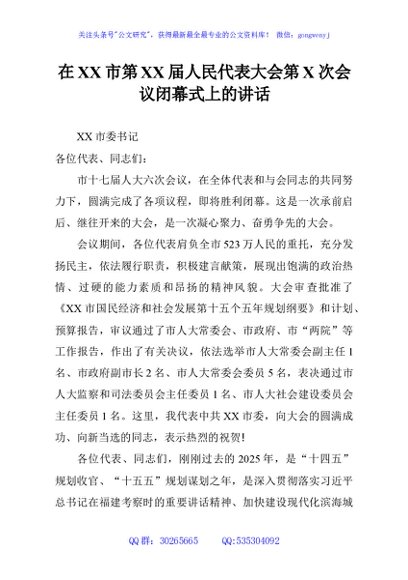 未生成预览图,长按二维码添加 在XX市第XX届人民代表大会第X次会议闭幕式上的讲话 - 公文研究