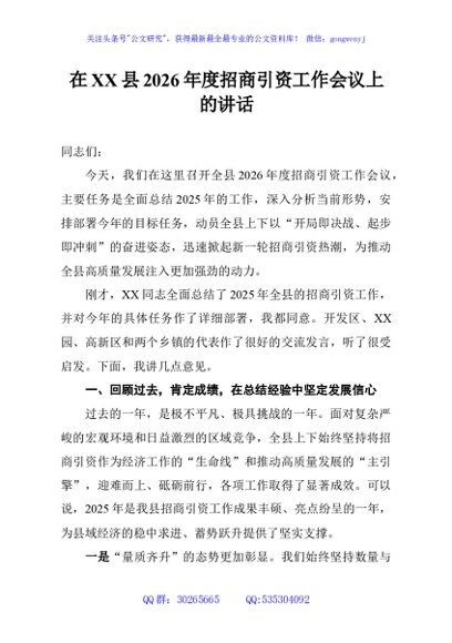 未生成预览图,长按二维码添加 在XX县2026年度招商引资工作会议上的讲话 - 公文研究