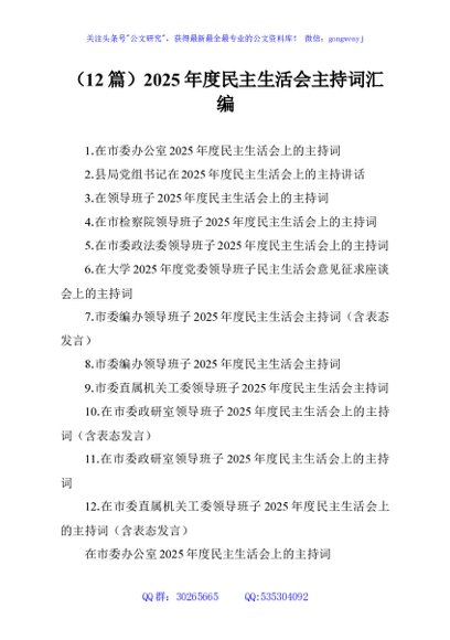 未生成预览图,长按二维码添加 (12篇)2025年度民主生活会主持词汇编 - 公文研究