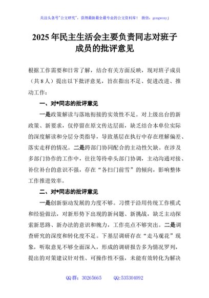 / 2025年民主生活会主要负责同志对班子成员的批评意见